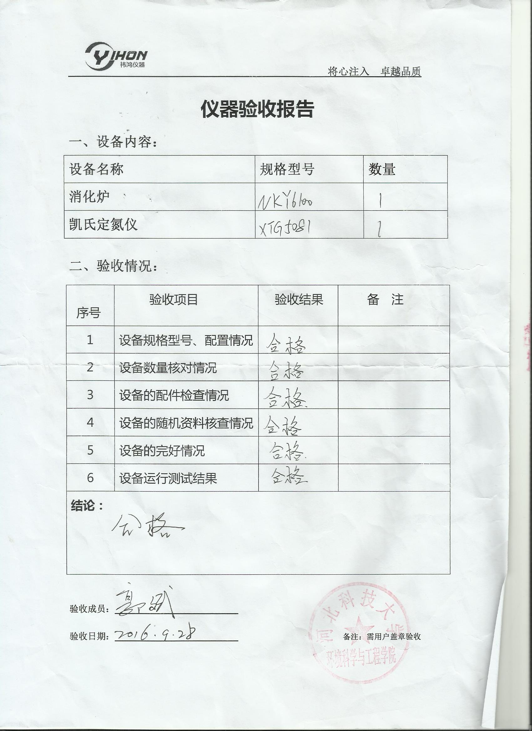 我們祎鴻人嚴格按照評標委員會對產品質量,生產周期,售后服務等等的要求,逐條落到實處。按時安質按要求的完成了本次投標項目,以下是儀器驗收報告。