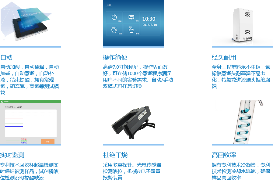 自動化程度 參數(shù)設(shè)定后,儀器自動完成品加酸、稀釋、加堿、蒸餾、吸收及管路淋洗