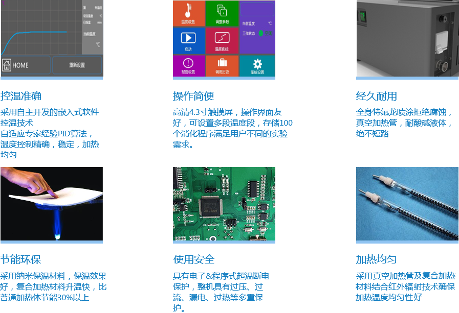 XTG5081紅外消解儀采用電熱絲復合真空加熱技術,升溫效率高,溫度均勻性好。采用行業領先的納米云隔熱材料,熱效率高,節能環保。更具有4.3寸高清LCD觸摸屏操控界面,簡單易懂,并具實時顯示溫度曲線功能,摒棄了以往溫控表頭繁瑣的操作。